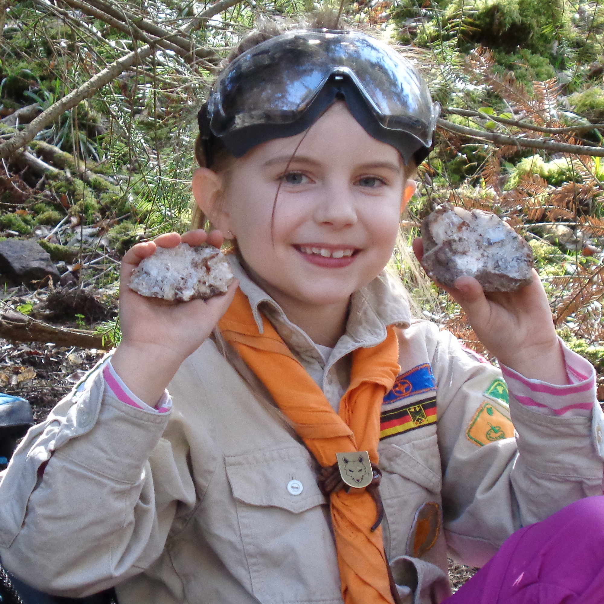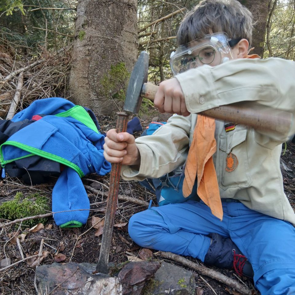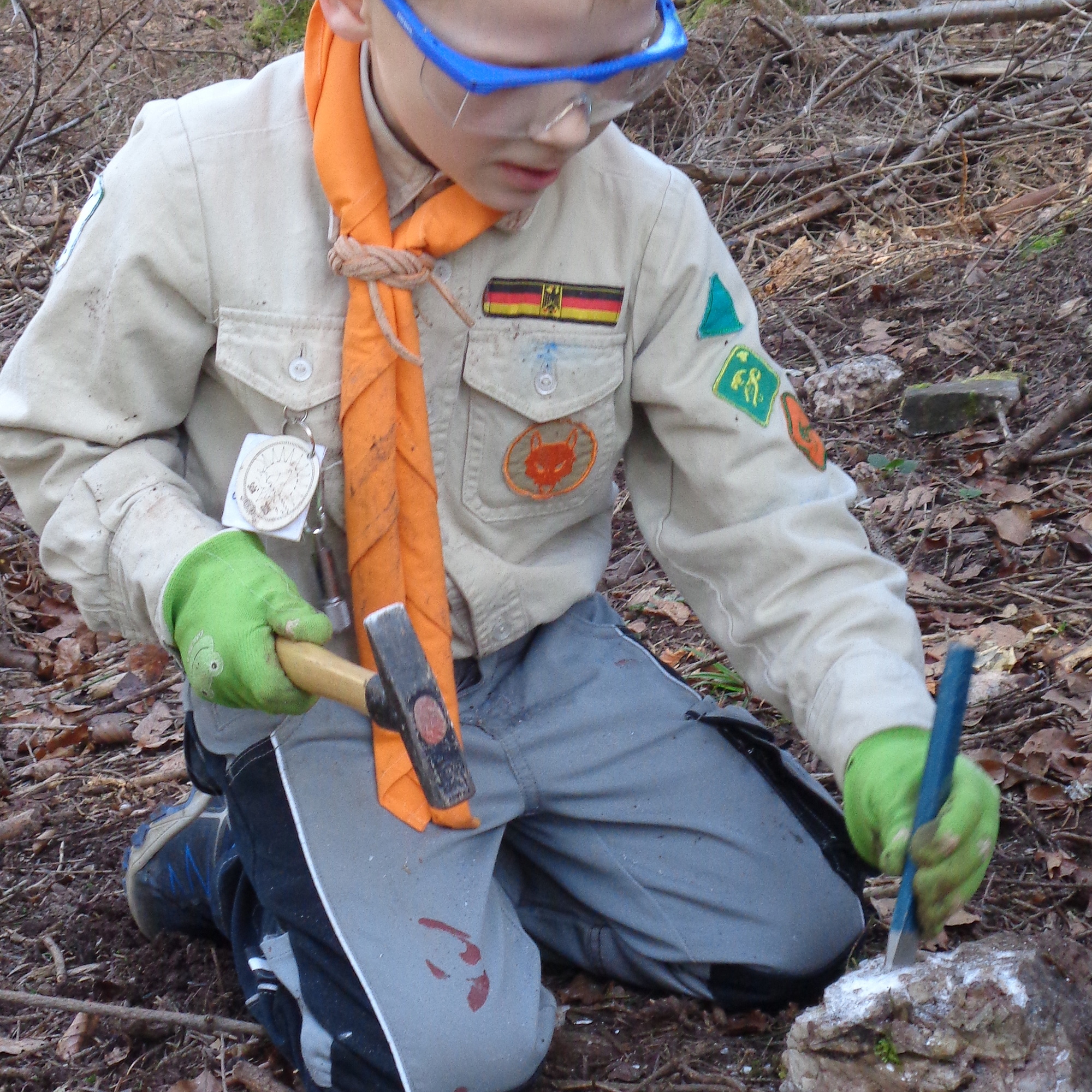 Voll Tatendrang ziehen die jungen Pfadfinder in den Wald und werden bald fündig! Große und kleine Gesteinsbrocken sammeln sich und werden genau unter die Lupe genommen. Mit Hammer und Meißel können die Wölflinge auch ins Innere der Steine blicken und entdecken viele verschiedene Mineralien. Die schönsten Funde darf jeder natürlich mit nach Hause nehmen, auch wenn die Auswahl nicht immer leicht fällt.